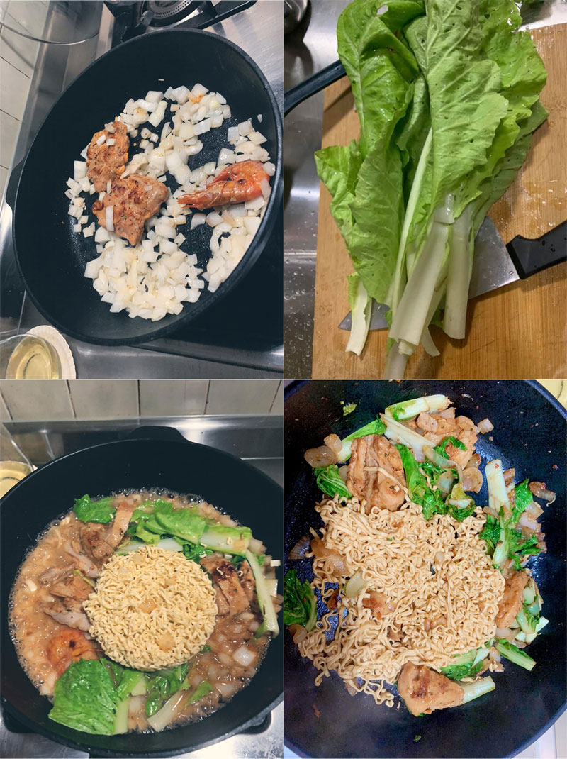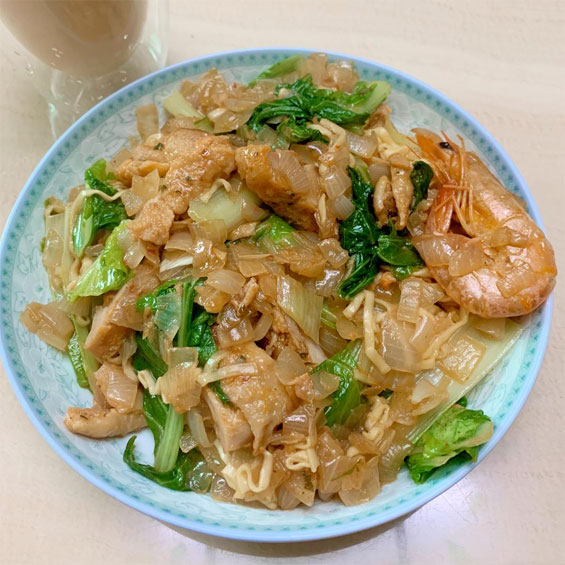 準備食材:泰式雞腿排、洋蔥切丁、任意青菜、白蝦、雞精/鮮味炒手料理步驟:熱鍋下油後,放入兩片泰式雞腿排,煎至兩面金黃、香味出來之後放入洋蔥丁拌炒一下,約30秒後倒入大約300cc的水 下一湯匙雞精/鮮味炒手,再放入一包泡麵、自己喜歡的青菜蓋上鍋蓋煮他個兩三分鐘 ,再開鍋蓋將水份炒乾(喜歡葉菜脆一點的可以此步驟在下青菜) 哇~~ 滿滿的泰式酸中帶點微辣的香味瞬間充滿整個廚房 實在是太開胃啦!如果你也覺得天氣熱沒胃口 不妨也來試試看